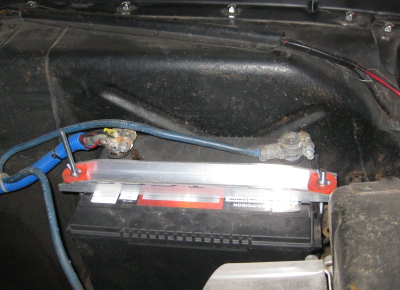 Bought a battery hold-down at the auto parts store. Actually, bought two - one long length, the other goes across the middle of the battery short-ways. Not sure which will fit.