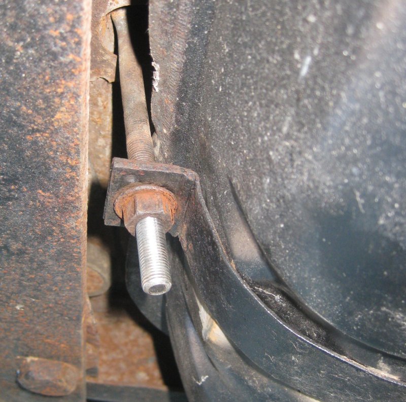 That other bolt in the lower left of the view measures ~1.15" across the flats (no, it's not 1 1/8 and it's not 1 1/4) - holds a thick steel strap across the rear-most frame member with another big bolt hanging down in the center. I believe this is the remains of a trailer hitch.