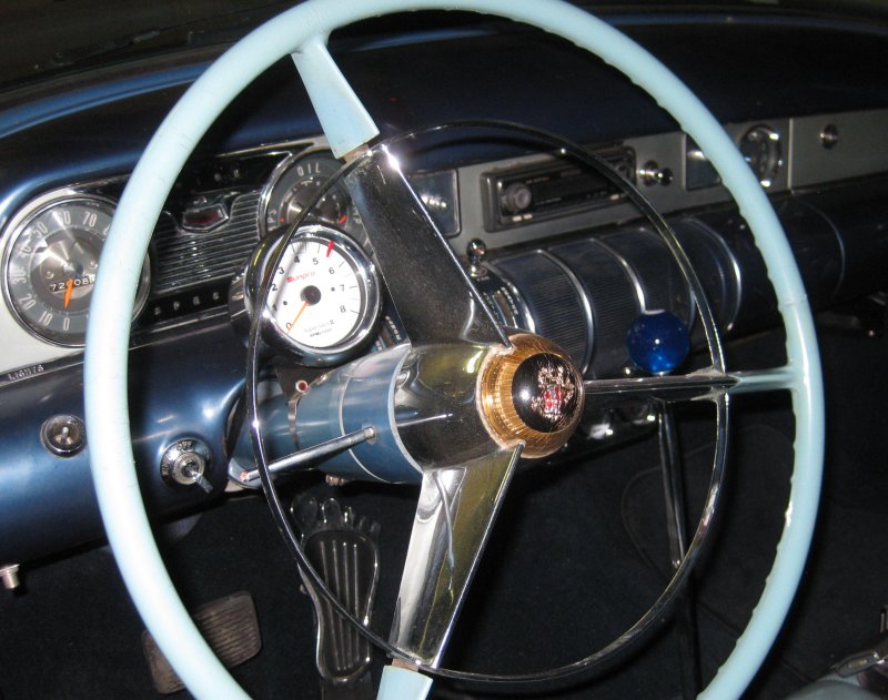 Went back out after dark to check lighting. Read the manual and found out that the headlight switch, aside from having 3 pull-out positions (off, parking, headlights) - also has 4 rotational positions. Pulling out to headlights, noticed a small red light between the turn signal indicators on the dash was on. Wonder if that's the high beams. Hit the high beam switch - yes, and a WHOLE BUNCH of red lights under and in the dash go ON with the low-beams. That's not stock, and somebody had a fascination with red lights! The added-on gauges under the center of the panel have night lighting (low-beams only) as well. And the red light discovery revealed that the original radio speaker location (that grille in the center of the dashboard) has a little panel with 2 red lights in it.