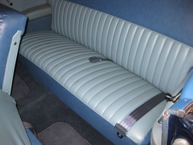 Sized up the center end of the belt - should be a couple of inches farther back than the old belt that was in there. Looked up under the car - looks like nothing but empty flat floor back there. Drilled the hole. Cut back the insulation mat around each belt attach point. Carol came out to wind the bolts in while I held up the fastener plates from below. Put the seat in - fits really nice. That's enough for today. May be able to finish off the back seat tomorrow.