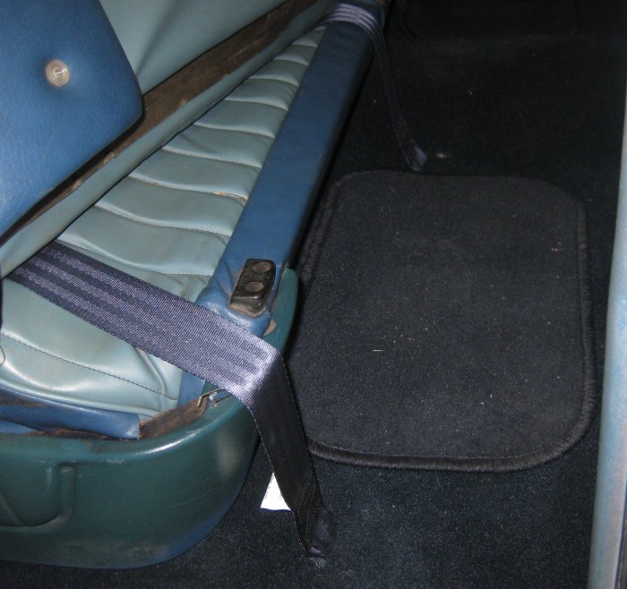 Driver's seat, outboard belt location. If someone had challenged me to bury the belt fitting under the carpet, I couldn't have done it. But by not trying too hard, I think it turned out really nice.