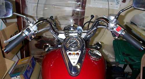The controls. Though the instrument on the tank looks pretty good, it's completely useless with a full-face helmet. The next bike might be the 1500 Vulcan, which I think has the same arrangement. If the instruments were ahead of the handlebars, that would work better.